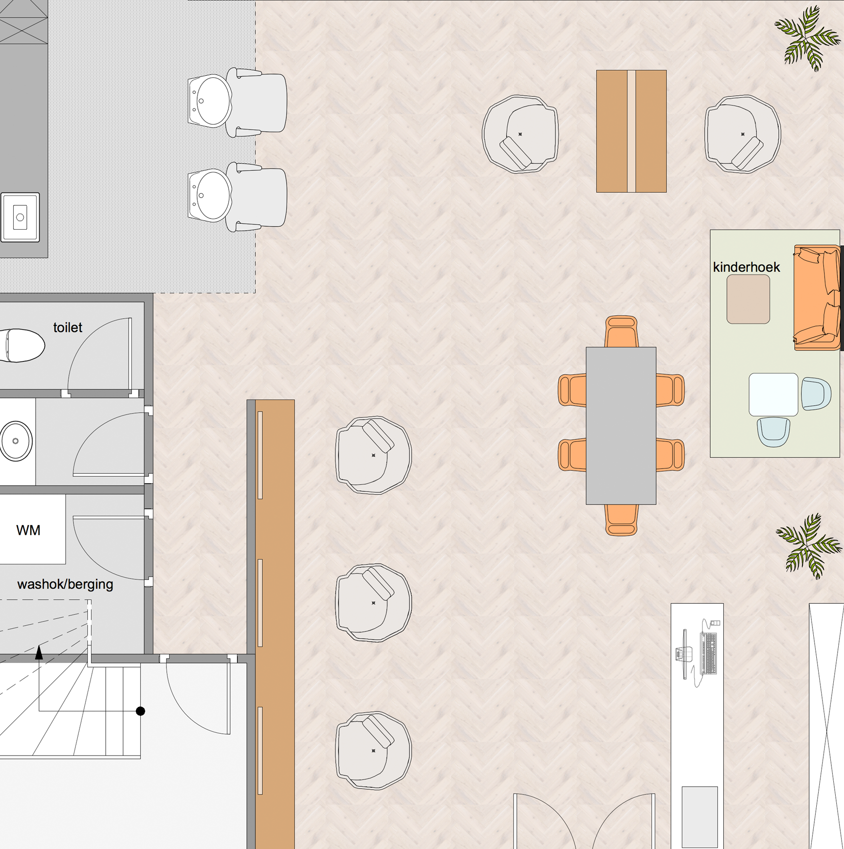 De wens was om minimaal 4 knipstoelen te hebben, en indien mogelijk 6 stoelen. Met een aantal bestaande meubels, zoals het kinderhoekje en de tafel met stoelen hebben wij in combinatie met een aantal nieuwe elementen verschillende indelingen gemaakt.